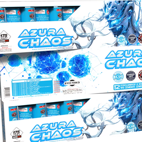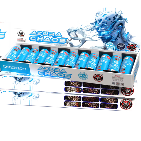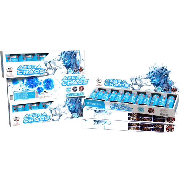 Punch blue holes in the sky with Azura Chaos! These preloaded shells feature gigantic rings with various palm pistils on every shot. 12 assorted breaks all with white glitter mines each in a compact 6.5" tube.