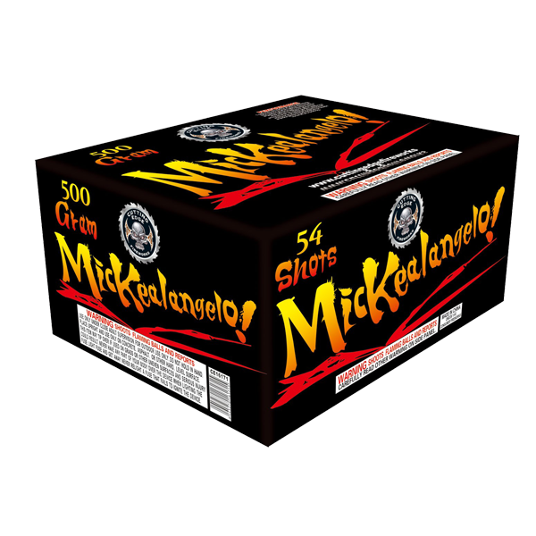Mickealangelo – A favorite amongst the 500 gram cakes. With multiple impressive effects, this 54 shot treasure has great pacing and really lights up the sky. Effects include red and blue dahlia with glittering, brocade shots with glittering, and golden palms. The finale is 5 amazing shots of brocade coconut with crackling. It was one of our top 3 sellers last year. Brand: Cutting Edge Fireworks Shots: 54 Size: 12″ H x 15-1/4″ W x 7-1/4″ D