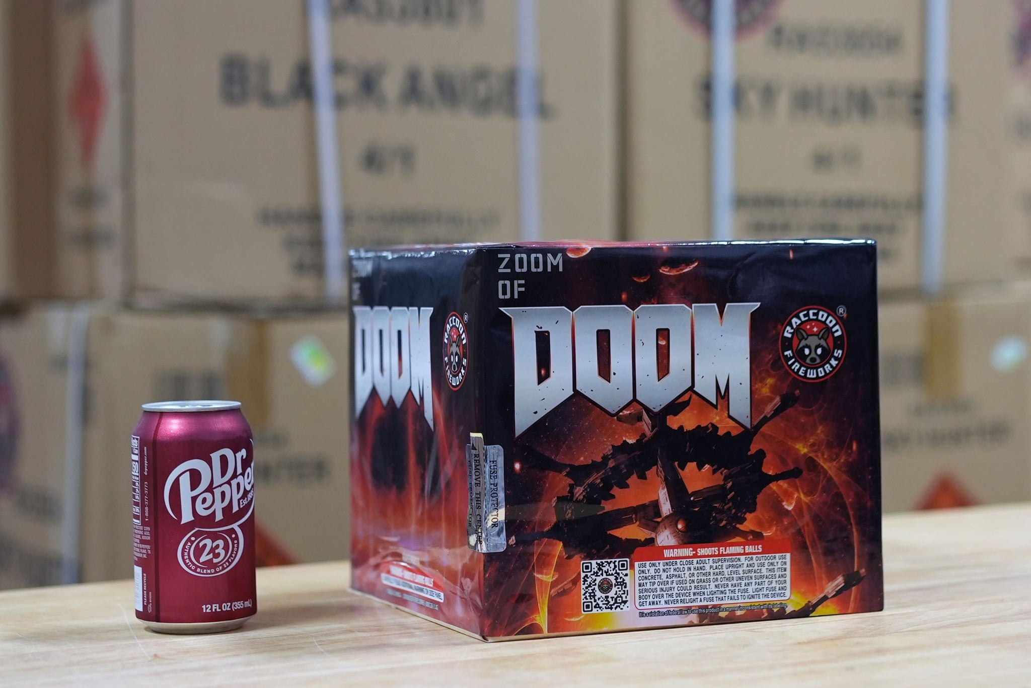 Zoom of Doom will sizzling through the night with its gold sizzling tails to sizzling willow with green, orange, purple and multi-color strobes.